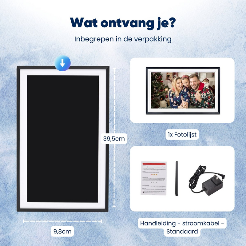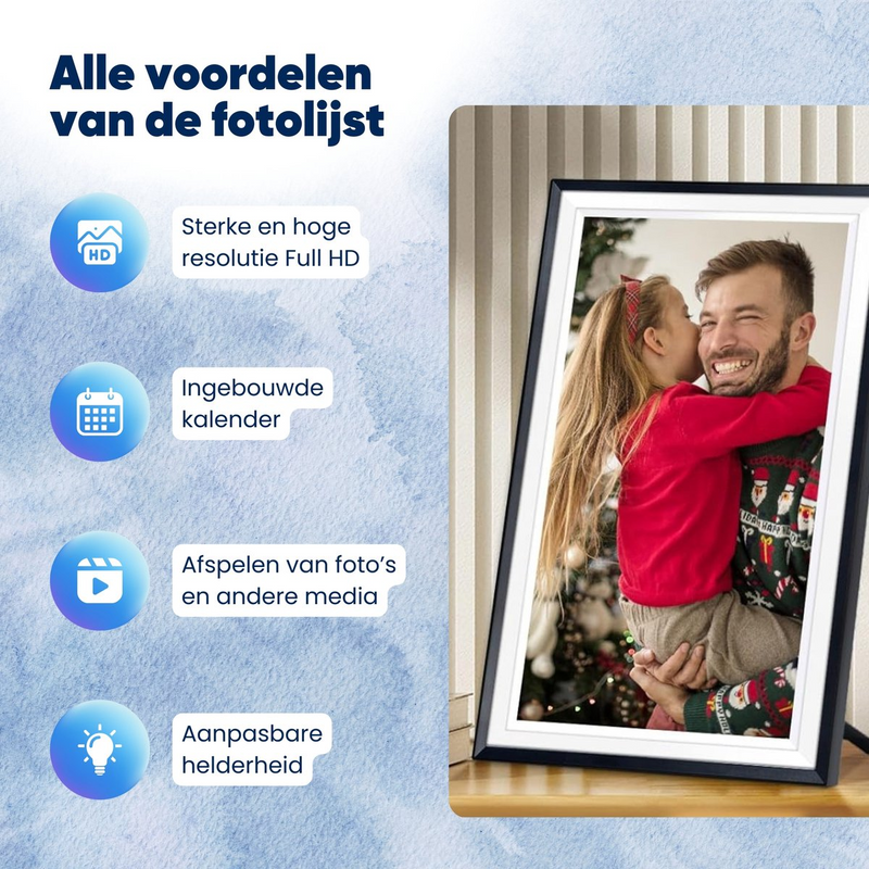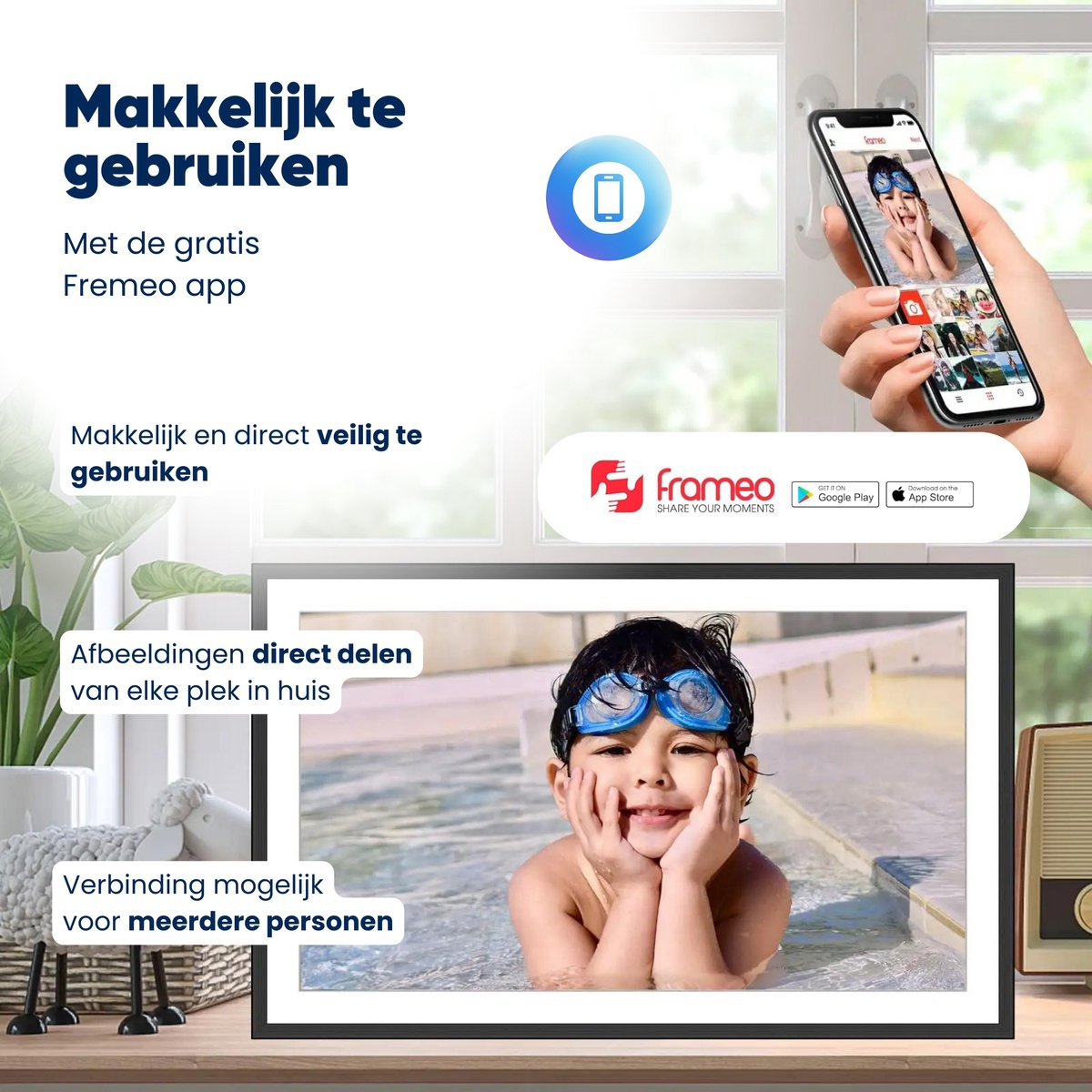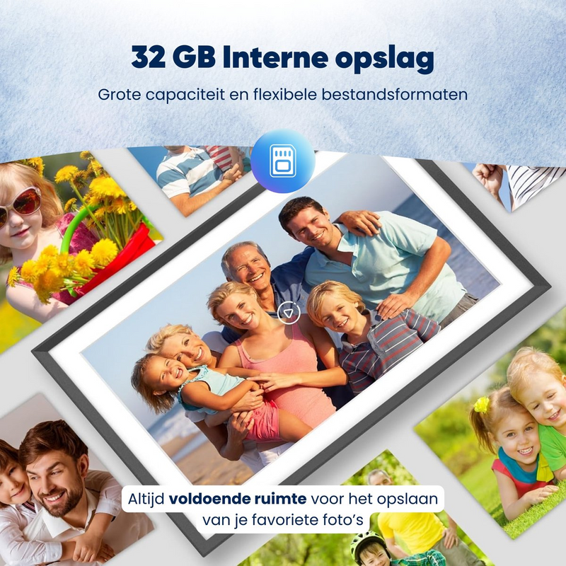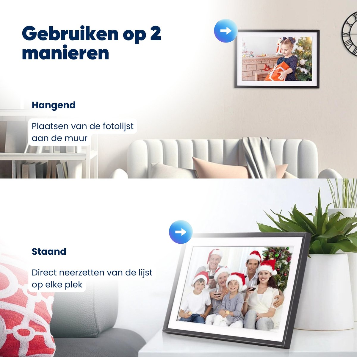 - Intuïtief en gebruiksvriendelijk – Bedien de fotolijst eenvoudig via het touchscreen. Instellen en personaliseren is nog nooit zo makkelijk geweest.