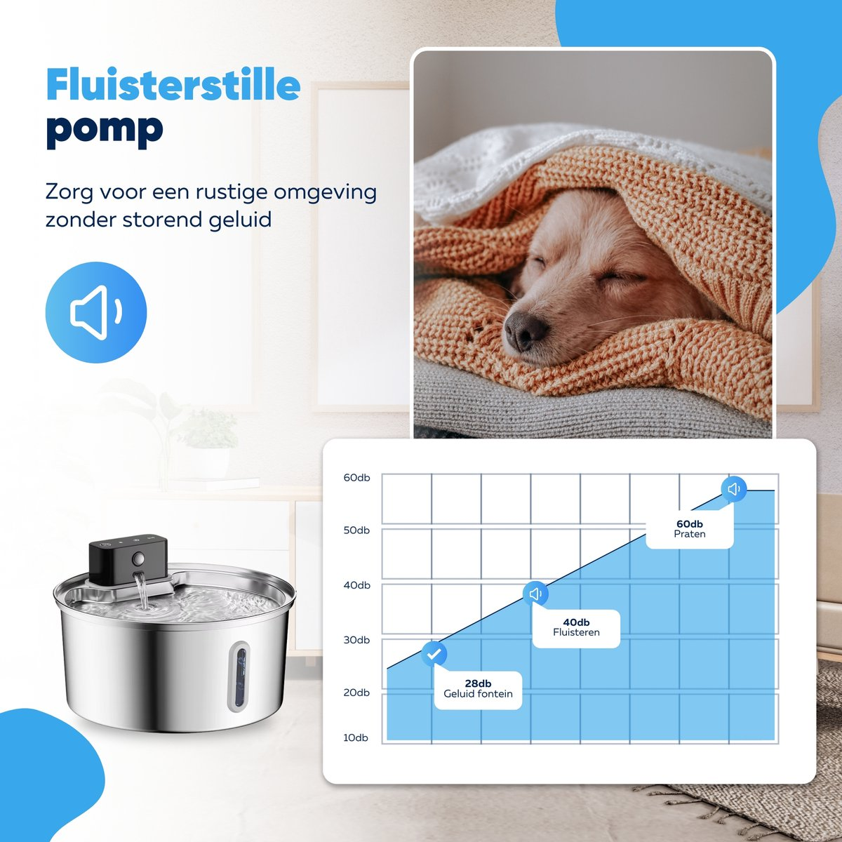 Het volledig RVS ontwerp is duurzaam, hygiënisch en makkelijk schoon te maken. Dankzij de fluisterstille werking kan je kat in alle rust drinken zonder afleiding. De fontein is oplaadbaar, zodat je geen gedoe hebt met kabels.