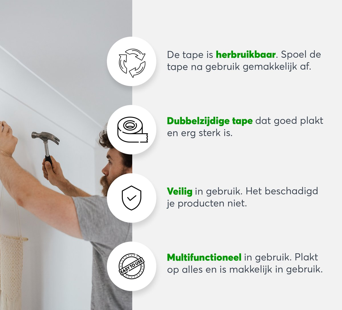 Duurzaam product Omdat je de tape voor bijna alles kunt gebruiken en hergebruiken, kies je voor een uiterst duurzaam product.