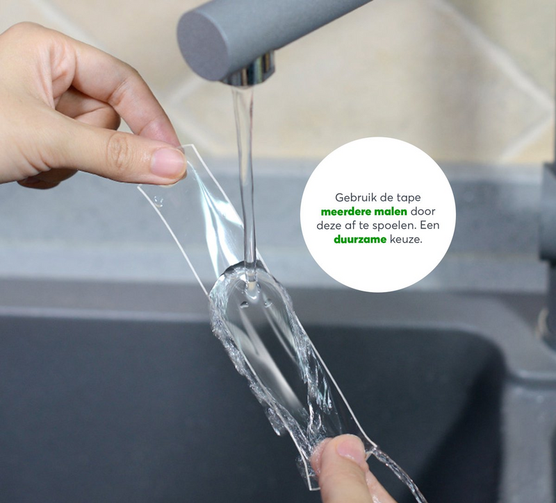 Herbruikbare tape De tape is herbruikbaar. Je kunt het onder lauwwarm water afspoelen en laten drogen. Zo gaat een rolletje erg lang mee.
