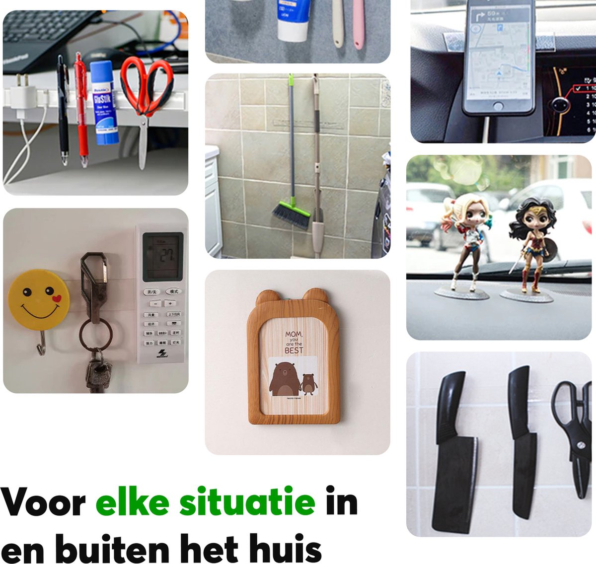 Multifunctioneel Te gebruiken om schilderijen op te hangen. Maar ook om iets in de auto vast te zetten of het vloerkleed op zijn plek te houden.