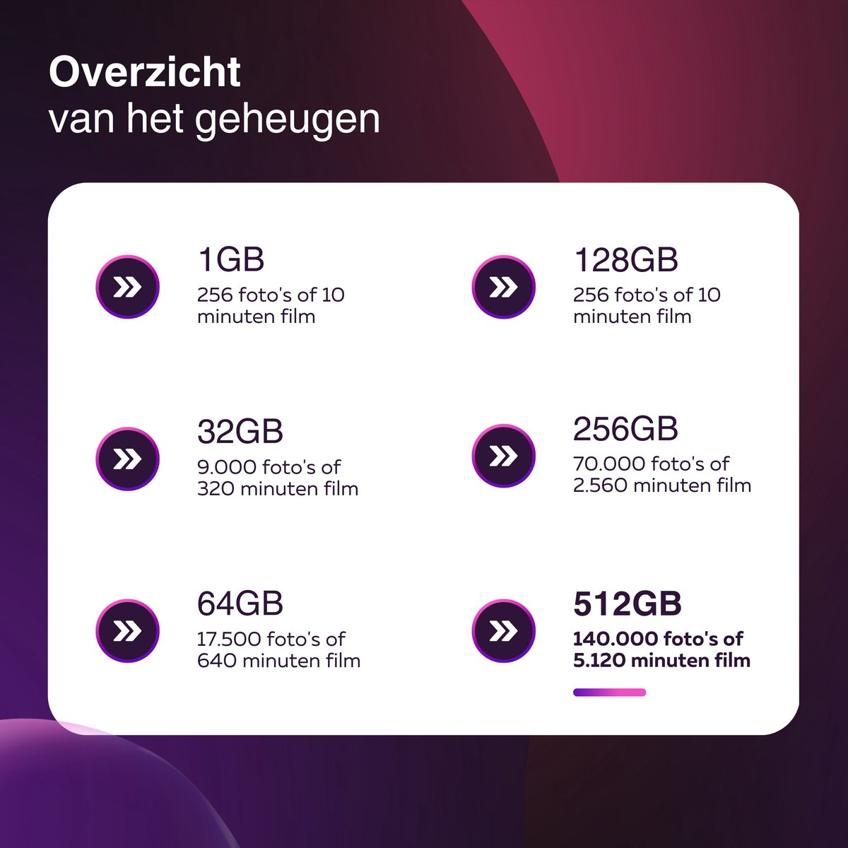Grote opslagcapaciteit – 128/256/512 GB voor duizenden foto’s, uren video en al je belangrijke bestanden.