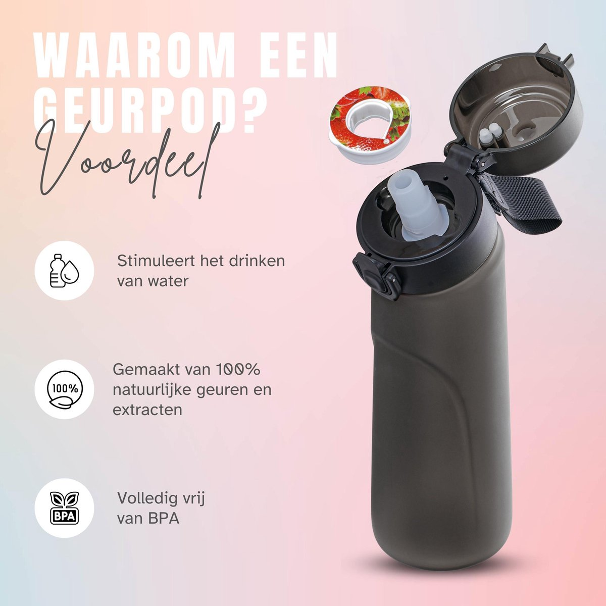 Maak kennis met onze Geurwater Drinkfles. Deze elegante waterfles geeft aan gewoon kraanwater een verfrissende smaak. Met de keuze uit universele 12 geurpods geniet je voortaan van je favoriete drankje, zonder schuldgevoel! Terwijl je drinkt, registreert je neus de smaaksensatie, terwijl je eigenlijk gewoon water drinkt.