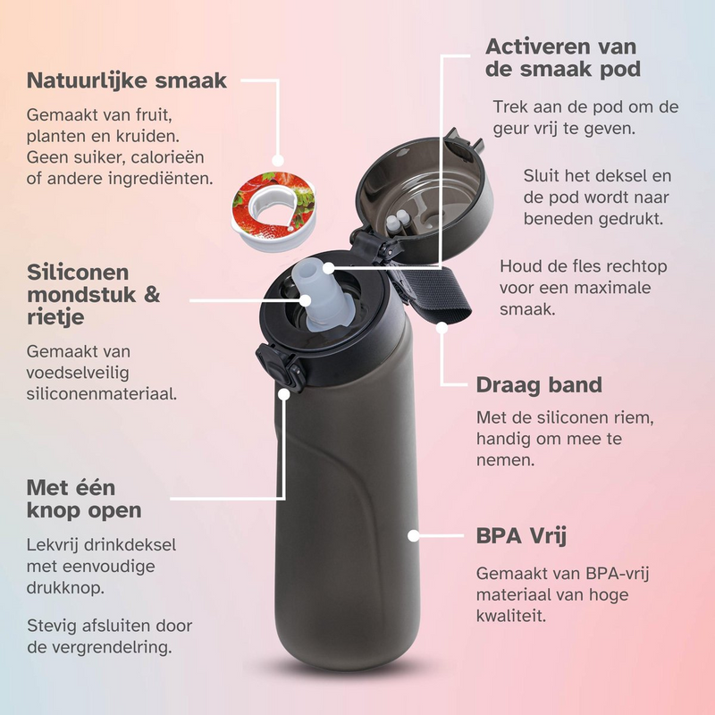 Door de geurpods in de fles wordt de smaak van het water verrijkt. Terwijl je drinkt, ervaar je de aroma's die je zintuigen prikkelen.