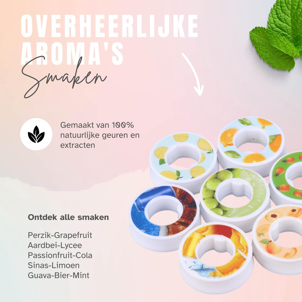 We bieden een selectie van 12 verschillende geurpods: Perzik, Grapefruit, Aardbei, Lychee, Passiefruit, Cola, Citroen, Limoen, Guava, Bier en Mint.