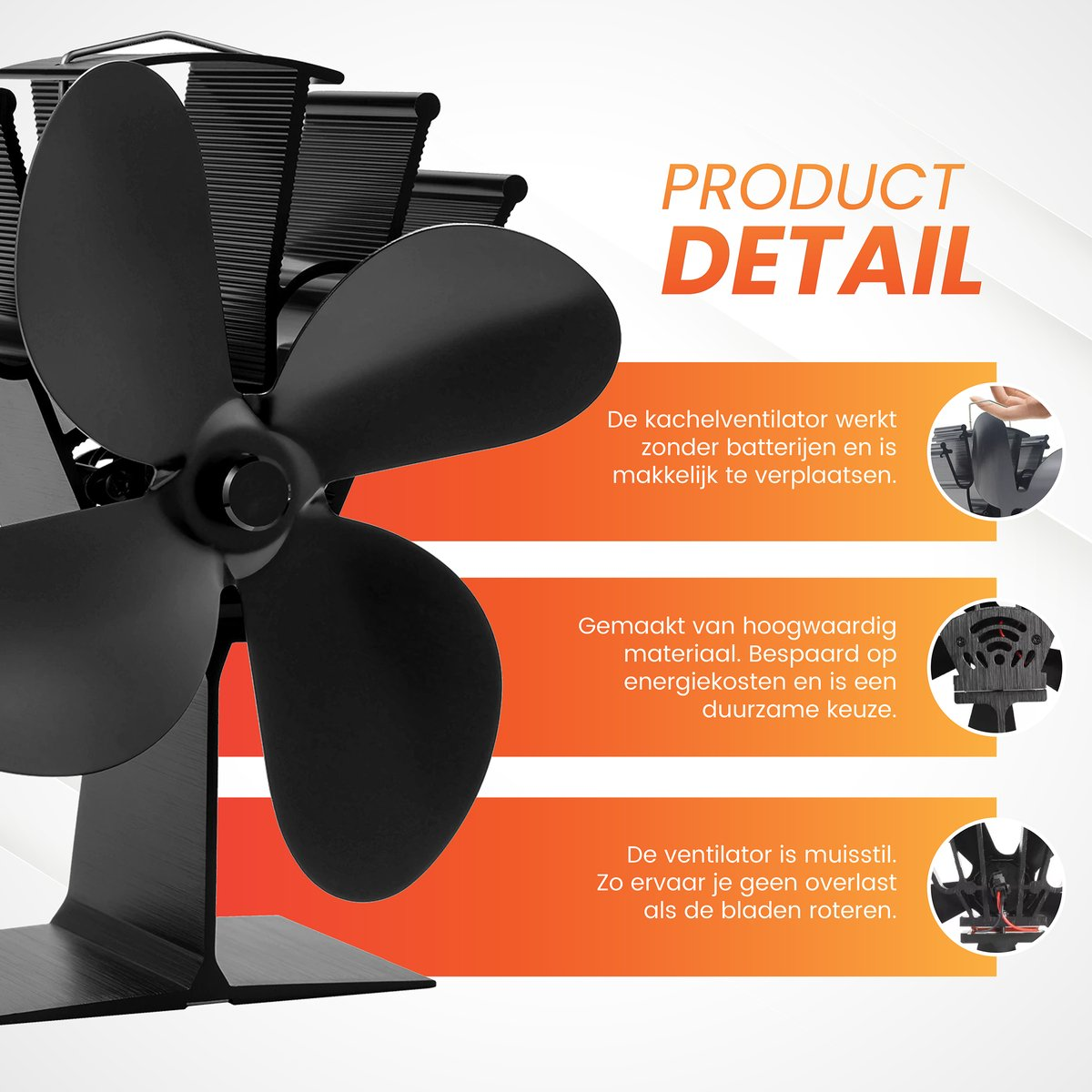Deze muisstille en stijlvolle haardventilator is gebruiksklaar en werkt zonder batterijen. Het luxe tijdloze design telt 4 propellers en is een aanwinst voor het oog. Dit gecertificeerde model verplaatst tot wel 6m3 warme lucht per minuut en werkt vanaf 50 °C.