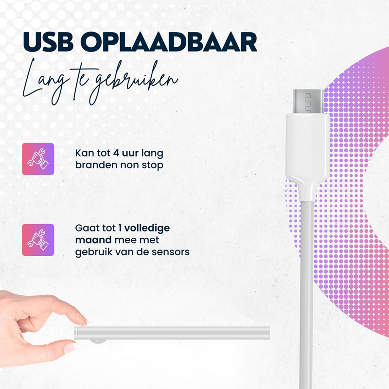 Magnetisch – De verlichting zelf is magnetisch. De bijgeleverde stickers houden hem op zijn plek. Je pakt hem er zo makkelijk af als je wilt opladen.