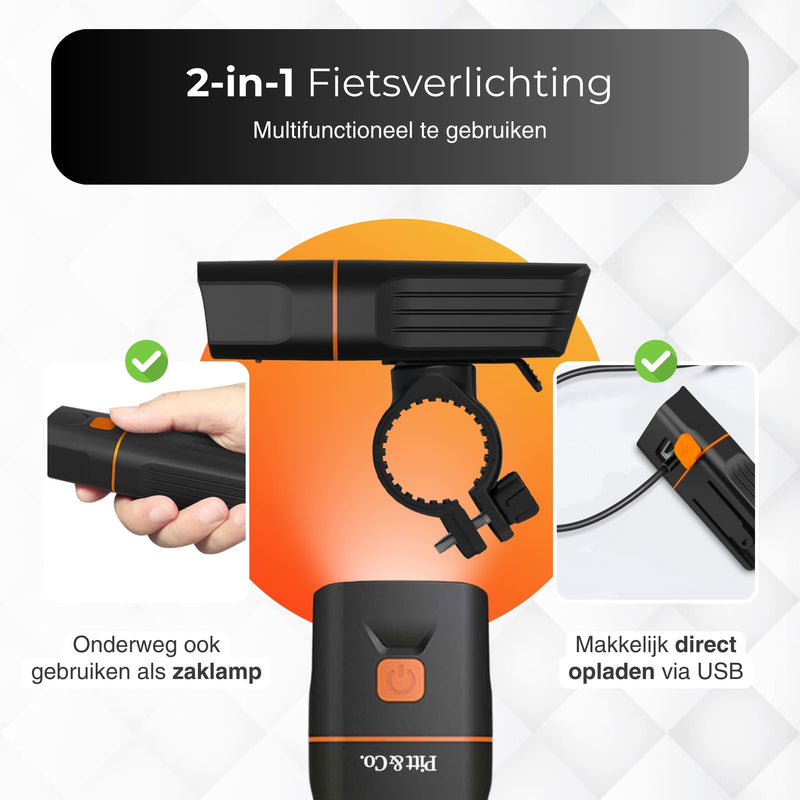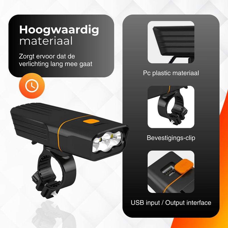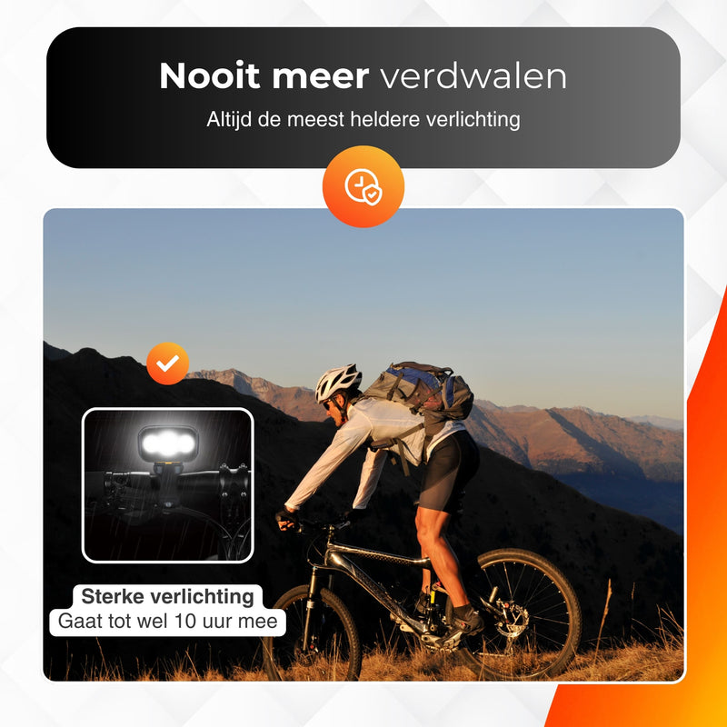 Je laad de set op met de meegeleverde USB-kabels, geen batterijen nodig. Eenmaal opgeladen gaat de fietsverlichting tot wel 10 uur mee. Of je nu een outdoor avonturier bent of gewoon op zoek bent naar een betrouwbare verlichting voor je dagelijkse ritjes, deze fietslicht set kan tegen een stootje. Het voorlicht is tevens te gebruiken als krachtige zaklamp, handig voor een wandeling!