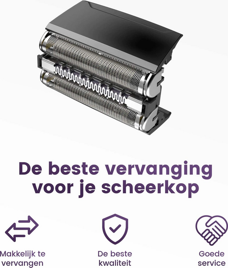 Deze scheerkop is geschikt voor de oude en nieuwe generatie 5 series. Verwijder het oude scheerblad, draai het messenblok 90 graden en trek deze eraf. Zorg dat je de mesjes niet aanraakt. Zet vervolgens de nieuwe mesjes erin en plaats het scheerblad terug op zijn plek.