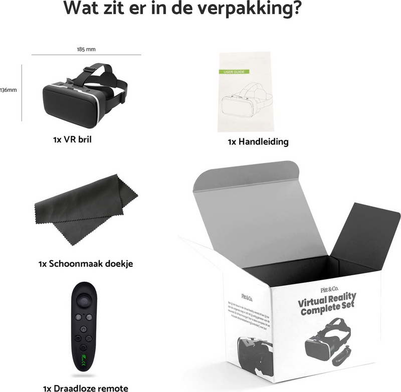 De set is geschikt voor alle soorten smartphones tussen de 4.7 en 6 inch. Ideaal voor VR video’s, games en te gebruiken voor educatieve doeleinde. Welkom in de 3D wereld. Virtual Reality, oftewel VR, is sinds 2012 enorm gegroeid. De technologie is nu ook vanuit je eigen huiskamer veilig te gebruiken. Met deze complete VR set word je bijna letterlijk omvergeblazen door de ervaring.